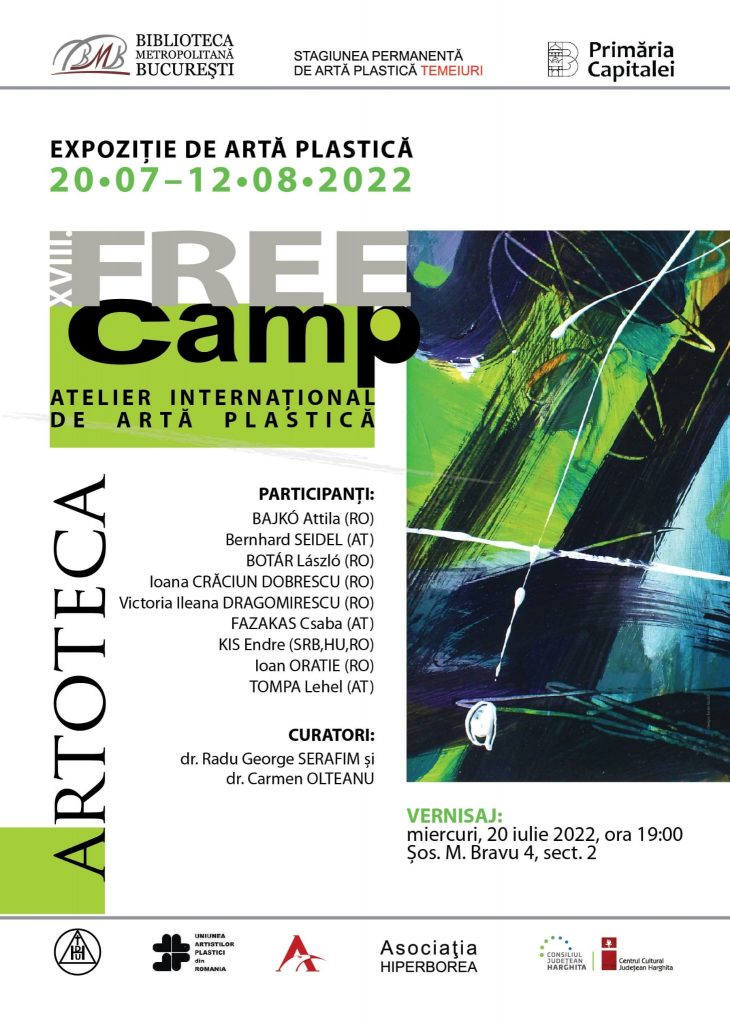 Biblioteca Metropolitană București (BMB) prin Direcţia Cultură, Învăţământ, Turism a Primăriei Municipiului Bucureşti anunţă vernisajul expoziției internaționale de artă plastică Free Camp miercuri, 20 iulie 2022, începând cu ora 19:00, la Artoteca BMB.