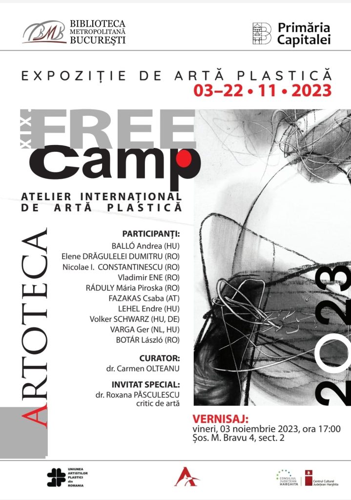 Biblioteca Metropolitană București (BMB) prin Direcţia Cultură, Învăţământ, Turism a Primăriei Municipiului Bucureşti anunţă vernisajul expoziției internaționale de artă plastică Free Camp, vineri, 3 noiembrie 2023, ora 17:00, la Artoteca BMB, șos. Mihai Bravu, 4.