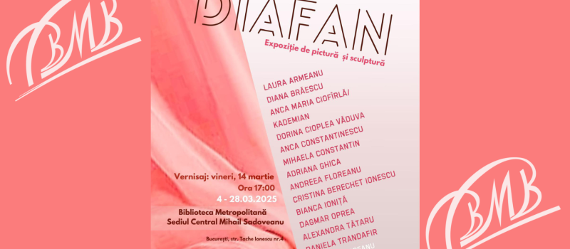 Primăria Municipiului București (PMB), prin Biblioteca Metropolitană București (BMB) are plăcerea să anunțe vernisajul expoziției „Diafan”, care va avea loc vineri, 14 martie 2025, la Sediul Central „Mihail Sadoveanu” din str. Tache Ionescu, nr. 4. Această expoziție reunește lucrările a treisprezece artiste talentate: Laura Armeanu, Diana Brăescu, Anca Ciofîrlă, Dorina Cioplea Văduva, Anca Constantinescu, Mihaela Constantin, Adriana Ghica, Andreea Floreanu, Cristina Berechet Ionescu, Bianca Ioniță, Dagmar Oprea, Alexandra Tătaru și Daniela Trandafir.