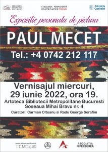 Biblioteca Metropolitană București (BMB) prin Direcția Cultură, Învățământ, Turism a Primăriei Municipiului București anunță vernisajul expoziției artistului Paul Mecet, miercuri, 29 iunie, ora 19:00, la Artoteca BMB, șos. Mihai Bravu, nr. 4.