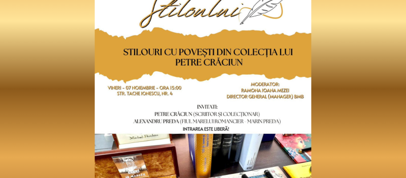 Primăria Municipiului București, prin Biblioteca Metropolitană București, organizează, pe 7 noiembrie 2025, ora 15:00, la Sediul Central „Mihail Sadoveanu” (str. Tache Ionescu nr. 4), un eveniment dedicat eleganței scrisului și pasiunii pentru obiecte care spun povești: „Stilouri cu povești – din colecția lui Petre Crăciun”.
