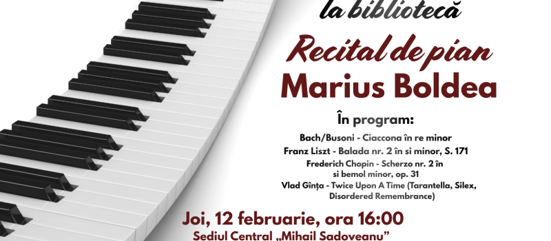 Iubitorii muzicii clasice sunt invitați la un eveniment de excepție, parte din seria „Opera la bibliotecă”, un recital de pian susținut de pianistul Marius Boldea, într-un program spectaculos ce îmbină capodopere ale repertoriului clasic cu expresii sonore contemporane.